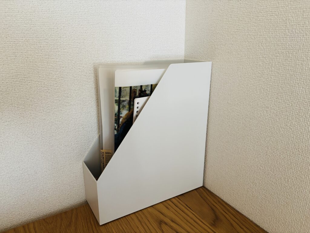 主にお気に入りの紙類を入れたファイル、レシートを入れるファイル、直近で必要な書類などを入れています。