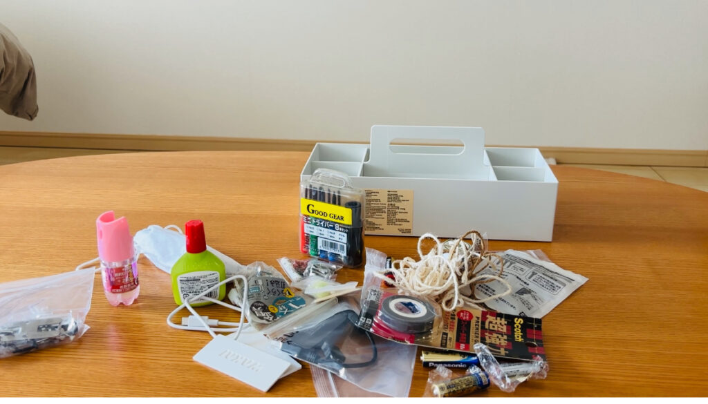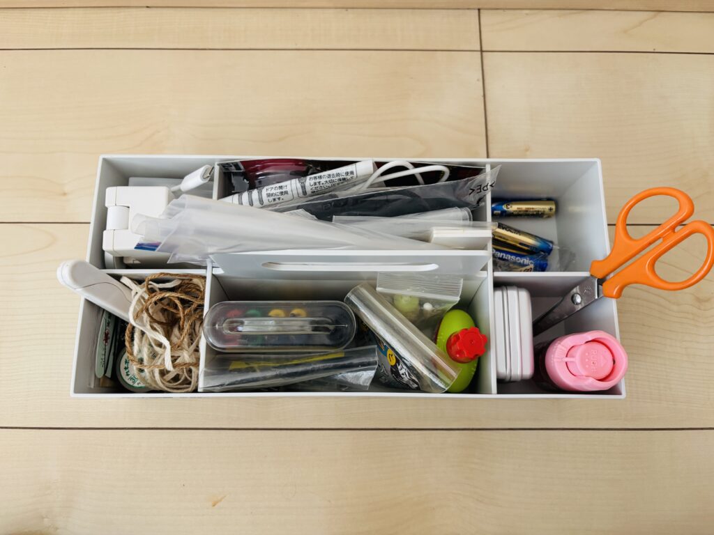細々した工具類、裁縫道具、電池、コード類…普段はあまり使わないけど必要なものをまとめて入れています。