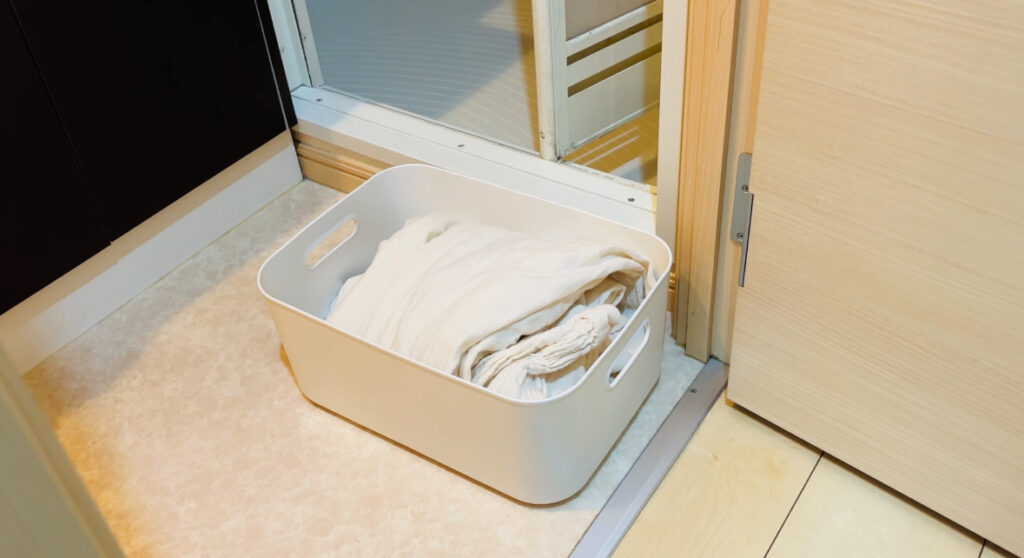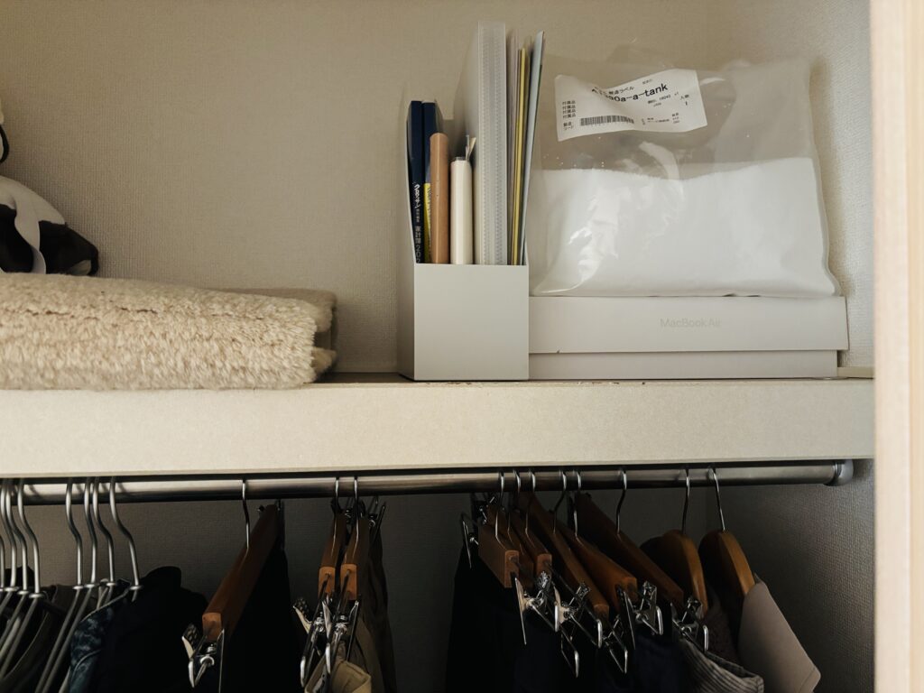 なのでパジャマなどをまとめて置いておく収納としてポリエチレンケースを使っています。(普段はそのままクローゼットの中に収納)