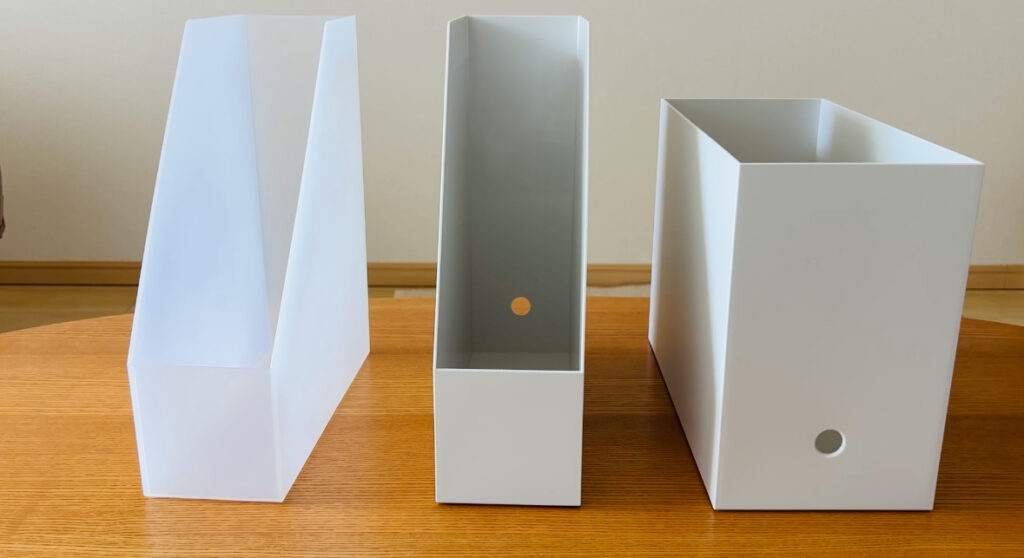 左はファイルボックスのスタンダードタイプ・ワイド。右2つはスタンドファイルボックス。
