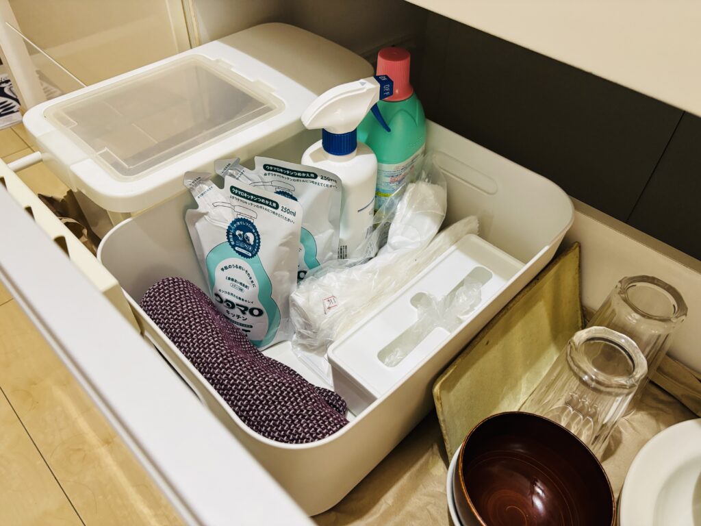 我が家のキッチンは引き出し式。上段に台所日用品をケースに入れてまとめています。